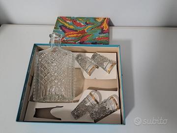 Elegante set vintage composto da una caraffa con tappo e sei bicchieri, perfetto per servire grappa o altri liquori.