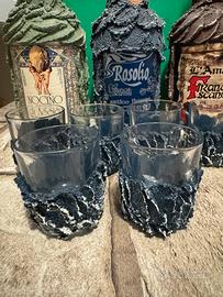 Splendido coordinato da bar/taverna vintage, originale di Assisi. Il set si distingue per la particolare lavorazione esterna "effetto roccia/corteccia" realizzata a mano, che riveste sia le bottiglie che la base dei bicchieri.