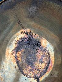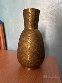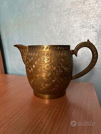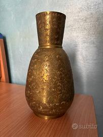 Vendo un set composto da una brocca e due vasi, interamente realizzato in ottone con decorazioni floreali incise a mano, acquistato durante un viaggio in India. L'ottone presenta una finitura calda e lucida che valorizza i motivi floreali su tutta la superficie esterna.