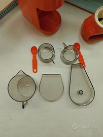 Oggetto di circa 50 anni, usato e ben conservato. Colori vivaci e brillanti. Pulito accuratamente. La scatola presenta normale usura sui bordi dovuta all'età.Coperchio trasparente del macinacaffè e il cassettino:presentano unapiccola crepa sul bordo , localizzata e non passante sulla cupola. Il coperchio è stabile e in posizione. Le altre linee visibili sulla plastica sonosegni originali dello stampo di produzione, non danni