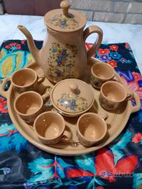 Nuovo. Mai utilizzato. In ceramica con motivo floreale. Colore beige e multicolore. Composto da 6 tazzine da caffè, zuccheriera, teiera e vassoio con manici diametro cm 30.