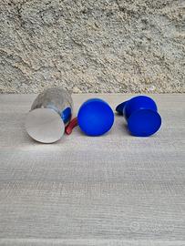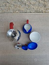 Il set è in alluminio pressofuso colore blu elettrico con pomoli e manici di colore rosso.