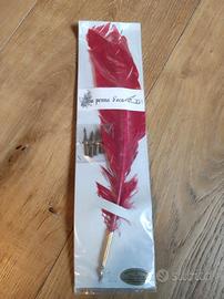 Materiali: Vera piuma d'oca tinta, calamo in metallo dorato, pennini in acciaio.