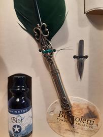 Un set calligrafia con piuma d’oca e inchiostro stilografico, realizzato completamente a mano da esperti artigiani.
