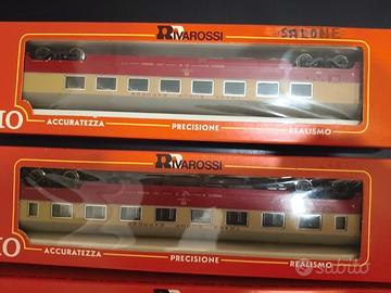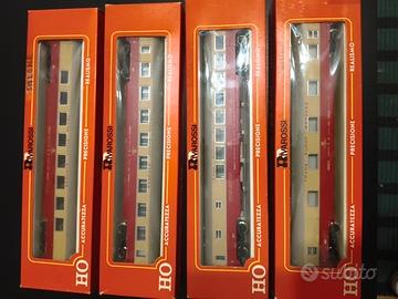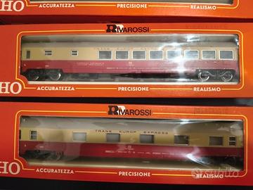 Set di 4 carrozze Trans Europa Express Rivarossi scala HO 1:87 composto da: carrozza ristorante, bagagliaio, carrozza salone e vettura di prima classe. Ogni pezzo del set viene venduto con le rispettive scatole Condizioni perfette