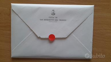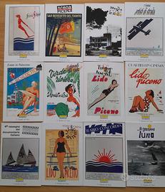 Serie "Città di San Benedetto del Tronto" set completo custodito nella sua busta originale con stemma comunale e bollino rosso. Contenuto 12 cartoline che riproducono manifesti storici e locandine di eventi della Riviera delle Palme (festival, teatro, lido, sport). Sul retro di ogni cartolina è presente il programma storico degli eventi (anni '30, '50, ecc.).