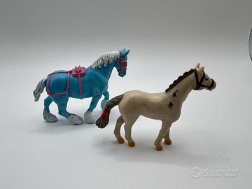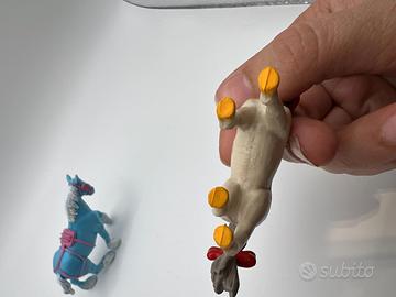 Set due cavalli in plastica vintage un pony M.E.G. del 1994 con fiocco rosso e un cavallo blu e rosa.