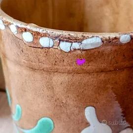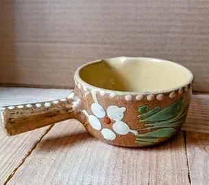 Soufflenheim ceramica alsaziana . France. '60/'70. Ceramica realizzata e decorata a mano con colori e motivi tradizionali. Piccola padella con versatoio e bicchiere. Non presenti segni di utilizzo. Segnalati per interruzione smalto 2 punti probabilmente legati alla fase di cottura. Bicchiere orlo cm 8 altezza cm 11. // Padellino larghezza cm 16 ( manico compreso) Altezza cm 5