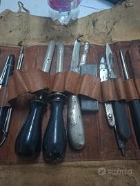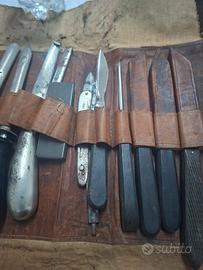 Set chirurgico veterinario vintage d'epoca. Composto da 17 attrezzi e borsa custodia in cuoio in buone condizioni. Per uso collezionistico