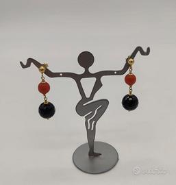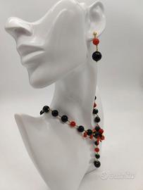 Per chi ama la Natura... Un richiamo al sole, al mare.. Bellissimo Set Collana e Orecchini fatto a mano con Corallo rosso naturale e perle di agata nera e tutto impreziosito con oro giallo 18kt. Le scaglie del corallo formano un grappolo al centro della collana regalando armonia a questo splendore. Il contrasto dei colori rosso e nero e le forme delle perline creano un fascino elegante e unico.