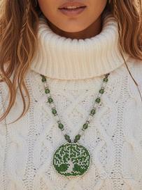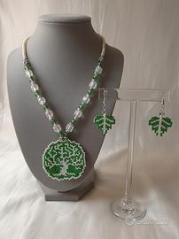 Un set Boho chic che incanta con la sua Collana Lunga Albero della Vita e gli Orecchini a Foglia nei toni del verde e avorio. Questa creazione artigianale esalta la luminosità del Cristallo "Maxima Preciosa" intrecciato sapientemente con eleganti perline cerate e perle di vetro, completata da dettagli in acciaio inossidabile. Il ciondolo e gli orecchini sono finemente impreziositi da un ricamo di minute beads di vetro che ne sottolineano il design sofisticato. Perfetto per donare un tocco di classe a qualsiasi outfit, questo gioiello versatile è ideale per tutte le stagioni e occasioni, celebrando la natura e l'eleganza senza tempo.