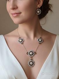 Questo raffinato set artigianale incarna l'eleganza intramontabile dello stile vintage vittoriano e neoclassico. La collana, un sofisticato modello a Y lunga 48 cm, è impreziosita da tre rosoni centrali e un pendente, tutti sapientemente intessuti a mano con la tecnica del bead weaving. Il design celebra la purezza dell'aragonite bianca, esaltata dal contrasto luminoso delle rocailles in ottone e dal brillio delle rondelle in cristallo. La struttura in acciaio inox rodiato assicura resistenza e lucentezza, mentre gli orecchini coordinati, dotati di perni in acciaio chirurgico anallergico, completano la parure con discrezione e classe. Un gioiello unico, perfetto per chi cerca un tocco di nobile rarità.
