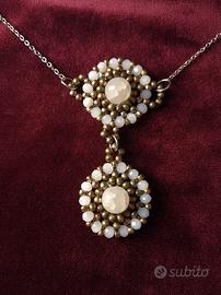 Set Collana Vintage Vittoriana Lunga Artigianale Pietre Dure Bianche Orecchini.