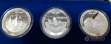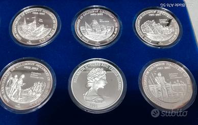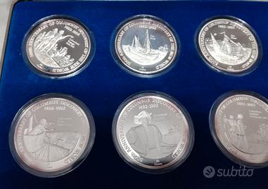 Vendo prestigioso set completo composto da 10 monete in argento .925, edizione Proof, dedicate al 500° Anniversario della Scoperta del Nuovo Mondo (1492–1992). Emissione ufficiale Turks & Caicos Islands. Il set comprende tutte le monete della serie, ognuna con scena o nave storica: La Nina La Pinta La Santa Maria Columbus Indians Exchange Gifts Columbus Encounters the Caribbean Columbus Leaves the Monolith Altre scene commemorative Ritratto di Queen Elizabeth II (1991) Caratteristiche: Argento sterling .925 Peso totale stimato: 280–310 g Argento puro: 260–285 g Qualità: Proof Monete in capsule protettive Cofanetto originale in ottime condizioni Condizioni: Perfetto stato di conservazione, nessuna ossidazione, incisioni nitide, capsule integre. Ideale per collezionisti di monete in argento e serie commemorative complete. Prezzo: 420 € trattabili (Valuto offerte serie) Consegna a mano in zona Spedizione tracciata e assicurata a carico dell’acquirente Nota: Set raro da trovare completo e in queste condizioni. Solo realmente interessati.