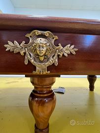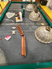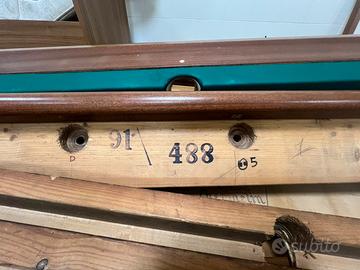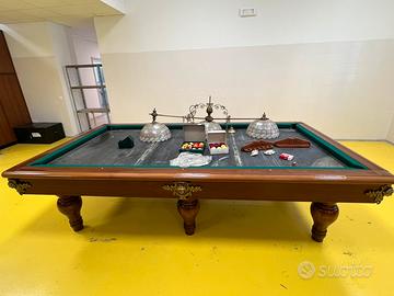 Proponiamo in vendita un’occasione rara per collezionisti e amanti del design d'epoca: un set da gioco completo della storica casa Hermelin Milano, sinonimo di eccellenza nel biliardo dal 1825. Il Set comprende: 1.Biliardo Hermelin Modello 6 Buche: Struttura in legno pregiato con gambe tornite e iconiche mascherine angolari artistiche in bronzo. Pezzo autentico e numerato (Matrice 91/488). Piano in ardesia originale in perfette condizioni. 2.Lampadario in madreperla : Rarissimo modello a sospensione in vera madreperla, coordinato al tavolo. Un pezzo d'arredo che da solo definisce l'atmosfera della sala (richiede piccolo restauro conservativo per alcune tessere). Da sistemare 3.Accessori Originali: Set di bilie , stecche e rastrelliera/autentici Hermelin. Condizioni: Il mobile è strutturalmente eccellente. Per garantire la massima integrità nel tempo, il biliardo è attualmente montato per favorire la visione integrale , ma puo essere smontato facilmente e pronto per il carico. Sponde in buone condizioni. Necessita di panno nuovo al montaggio. Prezzo del set completo: € 4.000 trattabili Un investimento in stile e qualità che non perde valore nel tempo. Il costo del trasporto e del montaggio professionale è a carico dell'acquirente.