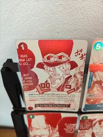 Set promo Op13 completo di 7 carte(veniva data una bustina con dentro una carta ad ogni box sigillato comprato) da gioco di One piece tgc gioco di carte collezionabili bandai originale in lingua inglese raffiguranti i personaggi di Monkey D.Luffy, Sabo e Portgas D.Ace. Condizioni Mint, perfette. Con bustina di protezione. Set che sta andando su di valore molto rapidamente.