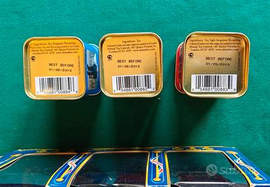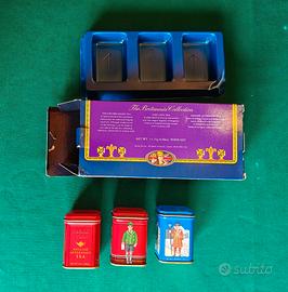 Set anni ‘90 di tre mini-scatole decorative, ispirate a iconici simboli britannici, vuote di latta (cm 6,5x4,5) in rilievo della collezione “The Britannia Collection” (con scadenza 1.5.2010), prodotte dalla “Ahmad Tea London”, nella confezione originale, in buono stato di conservazione, come da foto.