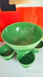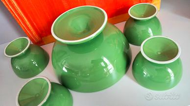Set di coppe da dessert o altro (macedonia, gelato, antipasti, stuzzichini, ecc.) in ceramica vintage. Linea essenziale, monocromatica, colore acceso e vivace: insomma non passa inosservato! I pezzi sono lucidi e brillanti, perfettamente integri. 🔹1 coppa grande: diametro 23cm, altezza 13cm. 🔹4 coppette: diametro 11,5cm. altezza 8cm.