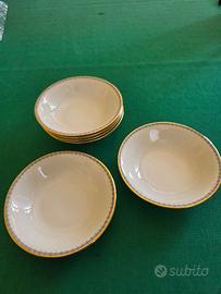 Set Coppette Schumann Arzberg Bavaria - Porcellana Avorio (Elfenbein) e Oro Raffinato set di coppette (ideali per macedonia, gelato o dessert) della storica manifattura Schumann Arzberg, eccellenza della porcellana bavarese. Questa linea è realizzata in Elfenbein Porzellan, una pregiata varietà di porcellana color avorio dalla finitura calda e setosa, molto ricercata dai collezionisti rispetto alla classica porcellana bianca. Dettagli: Decoro: Sottile ghirlanda geometrica e bordo rifinito in oro zecchino. Condizioni: Eccellenti, i profili dorati sono perfettamente conservati e la lucentezza della porcellana è intatta. Marchio: Presente sul retro con numero di serie (117), a conferma dell'autenticità. Un'aggiunta di classe per una tavola formale o per completare un servizio Schumann d'epoca.