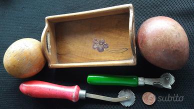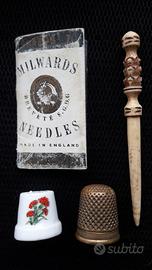 Lotto di piccoli vecchi oggetti riguardanti il mondo del ricamo / cucito e una piccola macchina da cucire in miniatura, molto bella. L' Antico agoraio e il punzone "lavorati" sono in osso , le due uova, il piccolo vassoio decorato e i manici colorati (rosso e verde) sono in legno, uno dei ditali è il classico in ottone mentre l'altro è in ceramica/ porcellana. Il porta spilli/aghi più piccolo è in metallo