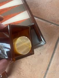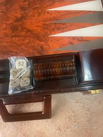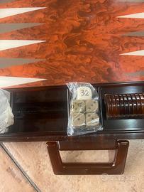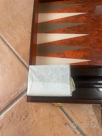 Si tratta di un set da backgammon in legno con intarsi, noto in italiano anche come tavola reale o