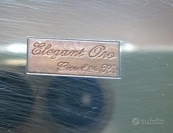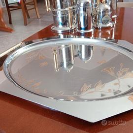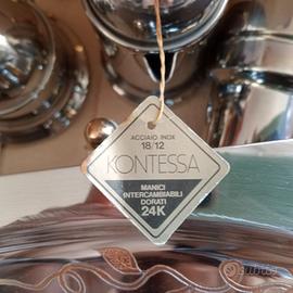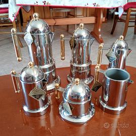 Set da caffé (3 caffettiere, una zuccheriera e 2 bricchetti per il latte) KONTESSA Acciaio Inox e oro 24K, con vassoio. Made in Italy 1980. Mai utilizzate (guardare il fondo delle caffettiere), ancora tutti gli elementi con l'etichetta.