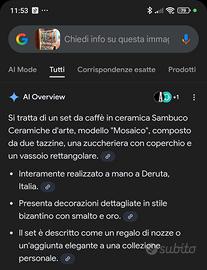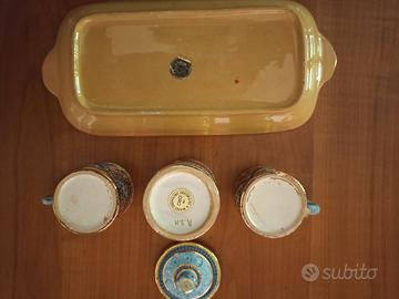 Set da caffè, Sambuco ceramiche d arte, modello "Mosaico", interamente realizzato a mano. Piccola sbeccatura interna sul coperchio della zuccheriera (foto allegata).