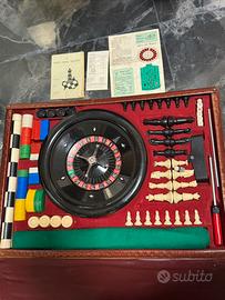 Questo è un set vintage da casinò o gioco da tavolo, probabilmente risalente agli anni '60-'80, contenuto in una valigetta. Contenuto: Include una ruota della roulette, fiches colorate, un panno verde da gioco, dadi e pezzi per il gioco degli scacchi. Oggetto da collezione: Tali set combinati sono considerati articoli da collezione vintage. Materiali: La ruota e altri componenti sono generalmente realizzati in plastica o bachelite. Scacchi e Dama: Pedine in plastica per entrambi i giochi; gli scacchi hanno uno stile classico. Fiches e Dadi: Numerosi gettoni colorati (fiches) di varie misure e un set di 5 dadi. Accessori da Casinò: Un tappeto verde in panno (layout per la roulette), un rastrello per fiches (manganello) e palline per la roulette. Documentazione: Libretti di istruzioni (come "Il Gioco degli Scacchi") e materiale informativo del Casinò Municipale di Sanremo.