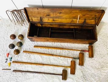 Marca A.W. Gamage Ltd, Holborn E.C. si riferisce a un set da croquet d'epoca venduto dal celebre grande magazzino londinese Gamages, situato nel quartiere di Holborn. Fondato nel 1878 da Albert Walter Gamage. Set competo in perfetto stato