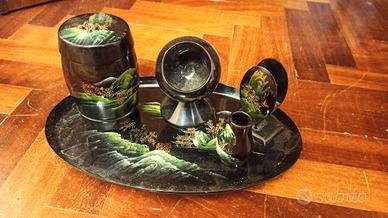 Un set da fumo molto elegante in legno e lacca dipinta, proveniente dall'Asia, Giappone. Dimensioni totali del vassoio: 28 x 17,5 cm In ottime condizioni generali, con una piccola scheggiatura sul fondo di uno dei pezzi visibile dalla foto.