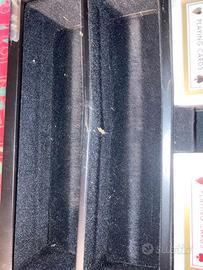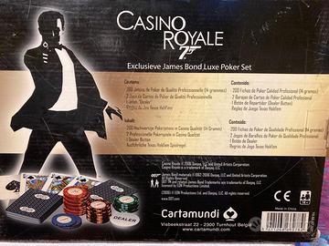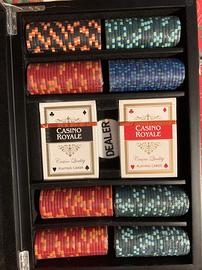Scatola da gioco realizzata in occasione del film Casino Royale. Nuova, mai usata carte e fiches da 14 gr. ancora confezionate. Si segnala, come visibile dalla foto, che due divisori sono danneggiati.Per gli interessati dispongo di ulteriori mazzi di carte e fiches, stessa serie, anche di valori diversi. james bond, 007 film.