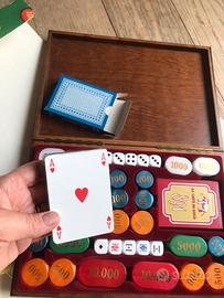 Set da gioco nuovo mai usaro che include elementi tipici del poker e di altri giochi di carte come fiches di diverso valore, dadi e 2 mazzi di carte sigillate .