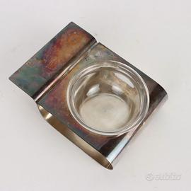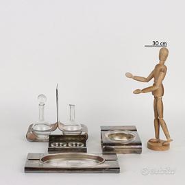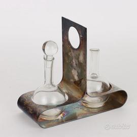 Set da portata in metallo argentato e vetro composto da oliera, saliera, vassoio