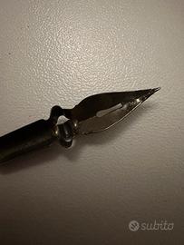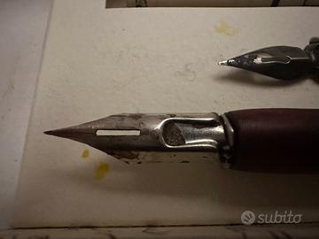 Set da scrivania pensato per chi si accinge ad imparare l’arte della bella scrittura. Il set si compone di una penna, tre pennini intercambiabili e due inchiostri. È inoltre presente una pergamena che racconta la storia della scrittura. Da segnalare alcuni segni del tempo sui vari pennini (visibili in foto). Inoltre il contenitore dell’inchiostro giallo è vuoto.