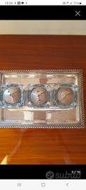 Calamaio da scrivania con tre boccette in cristallo e vassoio con piedini lungo cm 25, largo cm 17 e alto cm 12, in Argento Sheffield prodotto dalla ditta Royal Sheffield. Fatto a mano, fa parte di una collezione a numero limitato. Il peso del solo vassoio è di gr. 557.