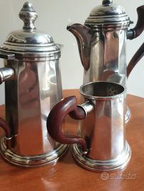 Elegante servizio da tè/caffè in Argento 800, composto da tre pezzi (due teiere/caffettiere + una lattiera), con manici in legno curvato in stile classico.