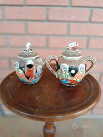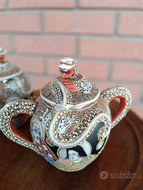 Set da te formato da teiera e zuccheriera, decorati con figure multicolore tipicamente orientali e il beccuccio della teiera a forma di drago