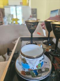 Set da the originale giapponese: un vassoio, 6 bicchierini a coppetta con sotto bicchiere, 5 tazzine in porcellana con piattini, teiera e zuccheriera. Come nuovi, originari del Giappone, regalo mai utilizzato.