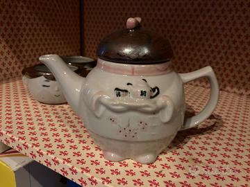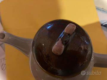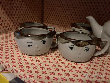 Teiera e 4 tazze in ceramica vintage, stile particolare da utilizzare o da collezionare, le tazze sono dipinte ognuna in modo diverso. La teiera è alta 14 cm, diametro cm 12 circa, larghezza massima cm 18. Le tazze sono alte 6 cm, diametro cm 8 circa, larghezza massima cm 12. Colore beige e marrone. € 20,00 tratt. Preferibile ritiro a mano Zona Saonara