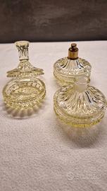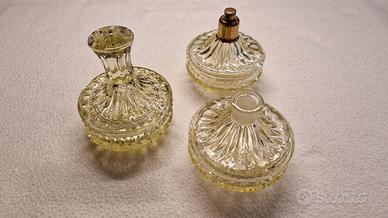 Set di tre oggetti da toeletta in vetro giallo, risalenti agli anni '30. Perfetti per aggiungere un tocco vintage alla tua collezione.