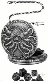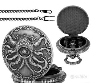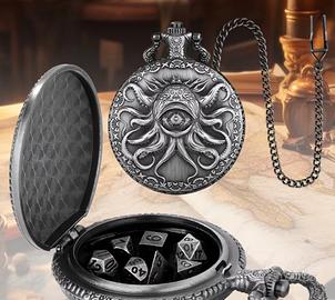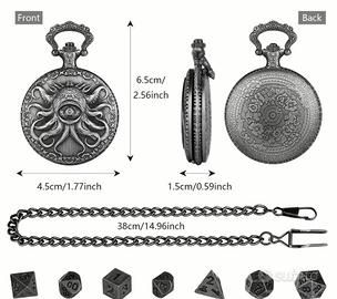Contenitore per dadi da gioco di ruolo (D&D, Pathfinder) con estetica vintage. Nota bene: Non è un orologio funzionante, ma un astuccio rigido a scatto progettato per trasportare il tuo set di dadi con stile. • Design: Fronte con occhio di Kraken/Cthulhu e retro finemente decorato. • Materiale: Metallo con finitura brunita. • Inclusi nel set: * Cassa portadadi (diametro 4.5 cm). • Catena lunga con gancio (38 cm). • Set completo di 7 dadi poliedrici coordinati in metallo. • Condizioni: Nuovo, mai usato. Perfetto per dungeon master e giocatori che cercano un accessorio unico per le proprie sessioni. #dnd #dungeonsanddragons #rpg #gdr #dice #cthulhu #steampunk #vintagestyle #dadi #geek #nerd #pocketwatch