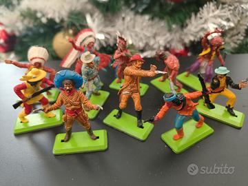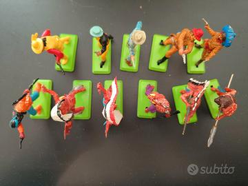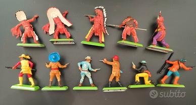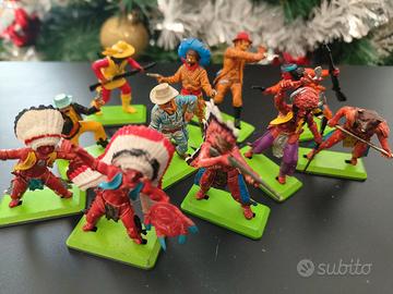 Set di 11 soldatini Britains Deetail. Indiani e cowboys. Qualche segno di usura del tempo(vedi foto). Un braccio e due armi mancanti.