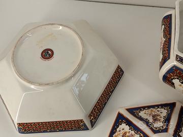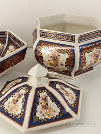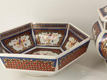 set 2 ceramiche giapponesi primi "900 composto da zuppiera decorativa dalla forma esagonale con coperchio e ciotola anch'essa dalla forma esagonale caratterizzato da motivo che raffigura pavoni e decorazioni geometriche floreali nei toni del blu,rosso e oro.
