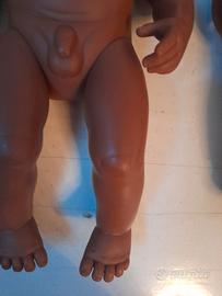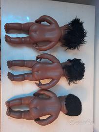 I bambolotti sono usati e in vendita per mancato utilizzo: sono integri, puliti e ottimi per la loro funzione di gioco o collezionismo, senza rotture o danni. Il set è composto da tre bambolotti realizzati in vinile di colore marrone. Ogni pezzo è caratterizzato da una differente capigliatura nera sintetica (stile riccio, mosso o dritto) e da lineamenti del viso realistici. Il materiale è liscio al tatto e i bambolotti presentano articolazioni a testa, braccia e gambe che ne permettono il movimento. Possono essere utilizzati come giocattoli educativi o come pezzi da esposizione per appassionati di bambole vintage. Il set completo ha un peso totale di 1,635 kg. Ogni bambolotto ha le seguenti dimensioni: altezza circa 38-40 cm, larghezza (alle braccia) circa 18 cm. Il costo è di 20 € per l'intero set. Possibilità di acquisto con oggetti per il tempo libero / garage, per la casa e lampadari. Ritiro in zona Scorzè oppure a Ferrara oppure spedito con costi di spedizione a carico del compratore. Per informazioni dettagliate scrivere al numero 3400947484