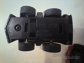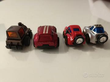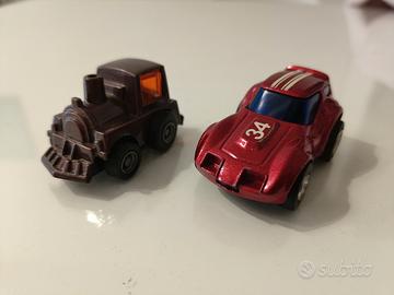 Set di quattro mini macchinine vintage. Due in plastica con retrocarica(funzionante) e due in metallo(trenino e corvette bordeaux). 3 Made in Macau e 1 in Hong Kong.
