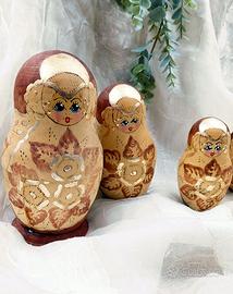 Aggiungi un tocco di eleganza senza tempo alla tua casa con questo splendido set di 5 matrioske in legno, interamente decorate a mano.