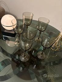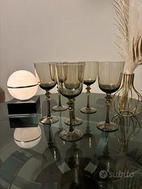 Elegante set composto da 6 calici vintage in vetro fumé color ambra/grigio, caratterizzati da una coppa ampia e leggermente svasata e da uno stelo slanciato con raffinata lavorazione tornita, tipica della produzione di qualità degli anni ’60/’70.