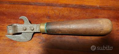 4 apriscatole o barattoli di latta degli anni '40-'50 con manici in legno Un modello ha un meccanismo rotante di verosimile provenienza statunitense
