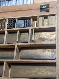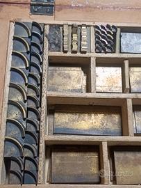 set di caratteri e matrici per la stampa tipografica a caldo (hot stamping) o per la doratura, completi di una cassetta in legno originale