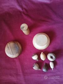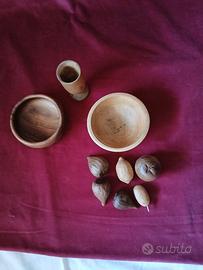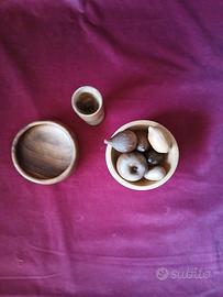- Ciottola grande in legno scuro venato (noce). Altezza cm 6, diametro cm 15. - Ciottola contenente 6 frutti in legno. Altezza cm 6, diametro 16. - Bicchiere porta uovo. H cm 13, diametro cm 6. In ottimo stato.